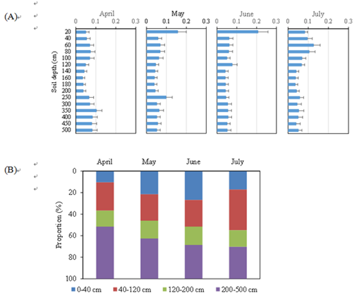 研究发现,刺槐在过渡期表现出明显的水分利用转变模式。4月,刺槐利用40-120 cm和200-500 cm土层的比例分别为26.2%和48.4%;5月,刺槐吸收0-40、40-120、200-500 cm土层的比例分别为21.5%、24.5%、37.4%;6月和7月分别有51.6%和53.6%的水分主要来自于0-120cm土层。因此,在旱季,刺槐主要吸收深层土壤水分(200-500 cm),随着雨季的来临,刺槐利用0-40 cm和40-120 cm土壤水分的比例增加。综合考虑土壤水分动态变化、根系分布特征和气象要素,能够很好的解释刺槐在旱季向雨季过渡时期的吸水特征与机制。