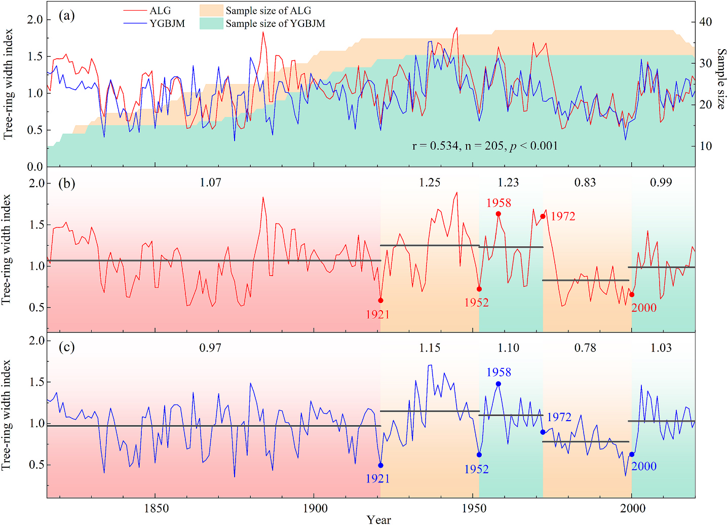 图1 树轮宽度记录与人类活动事件(图中圆点)