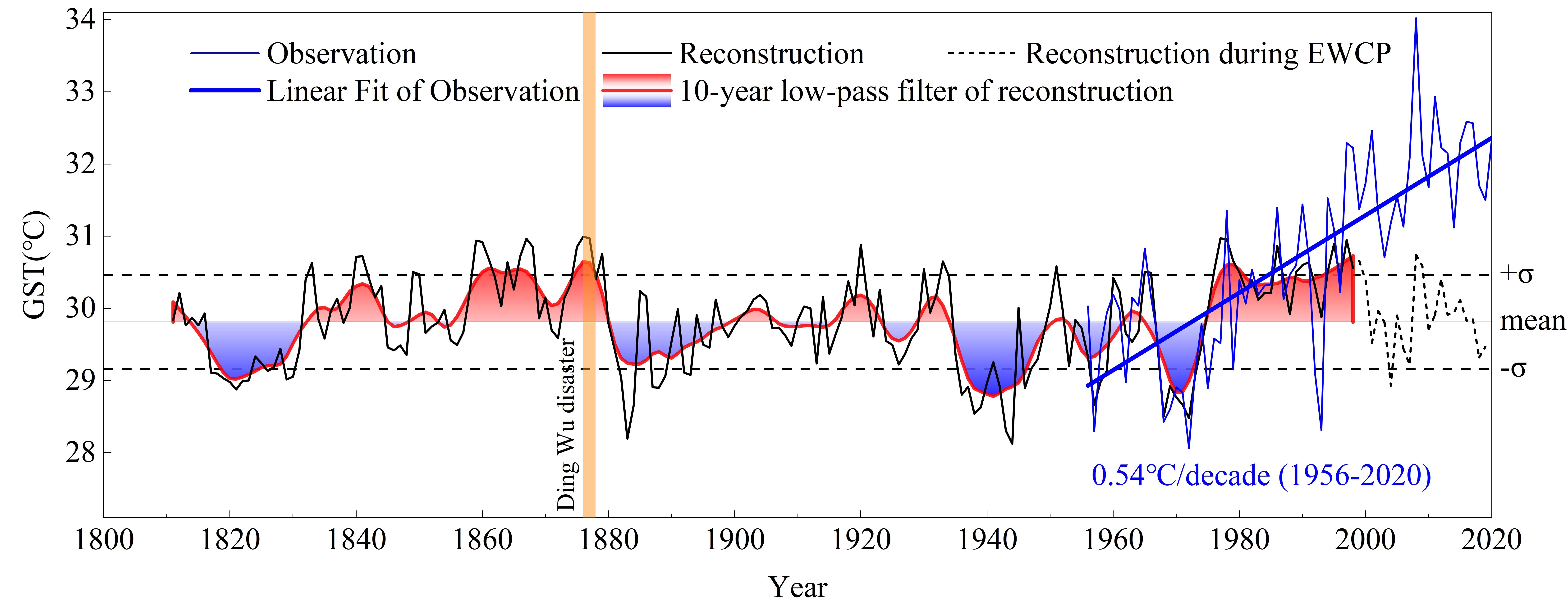 针对塔克拉玛干沙漠生态系统传统研究多聚焦水分限制而忽视高温影响的研究空白,研究团队利用胡杨树轮资料,重建了该地区过去188年(1811-1998年)5-7月地表温度变化历史。研究发现,在水分条件相对稳定时,夏季高温已超越水分条件成为荒漠植被生长的首要威胁;近20年地表温度的快速上升已突破过去200年的波动范围,构成新的生态威胁。研究同时揭示了大西洋多年代际振荡(AMO)通过环球遥相关调控区域温度的机制。研究结果深化了对干旱区气候变化规律的理论认知,为预测全球变暖背景下沙漠生态系统的响应及制定保护策略提供了关键科学依据。
