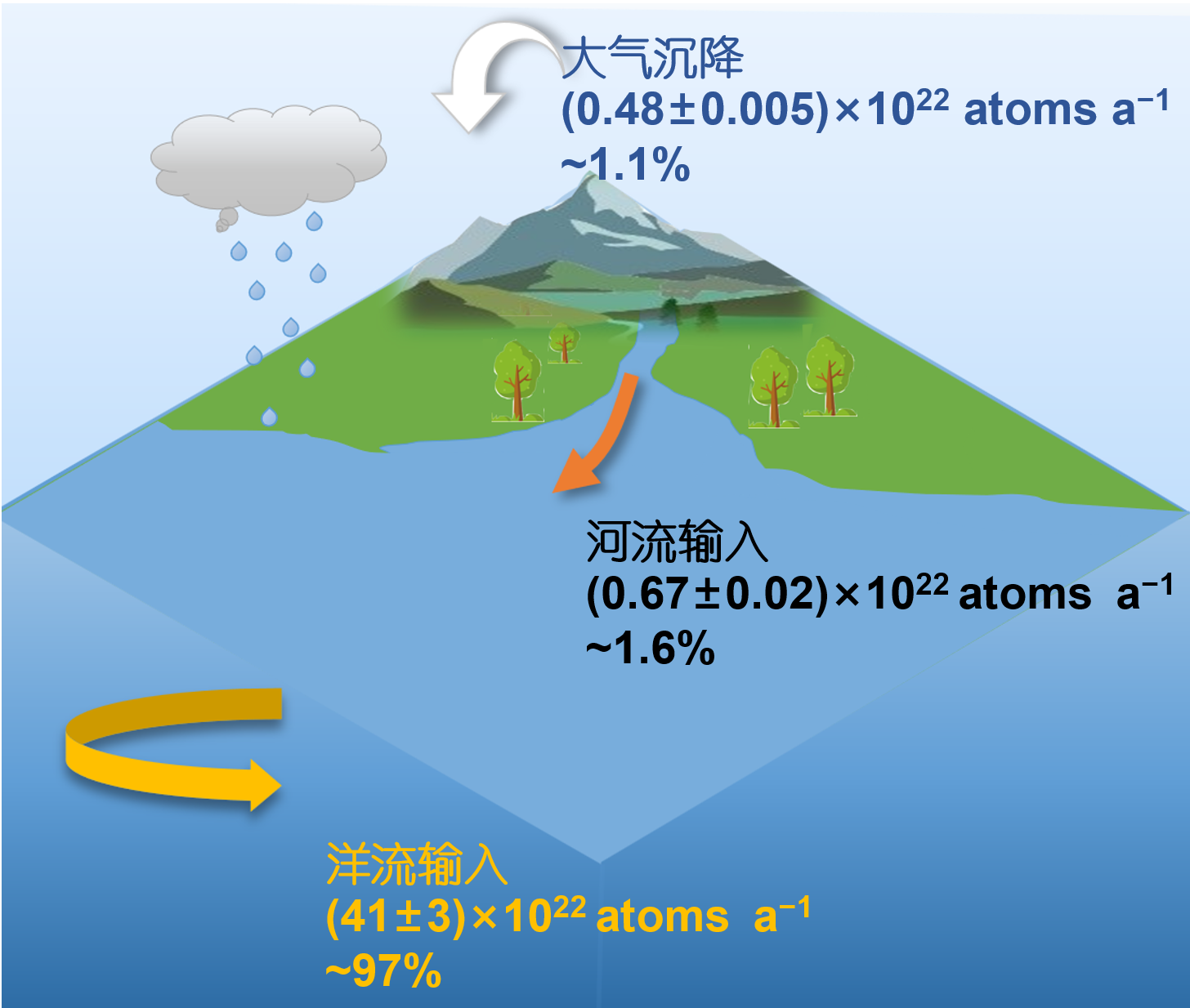 我室侯小琳研究员团队系统采集了南海北部海水样品,使用团队建立的超微量129I和127I分析技术,分析获得了碘同位素的水平和分布,揭示了该核素的分布特征与迁移扩散规律。研究表明,珠江河口区129I/127I原子比值高于开阔海域一个数量级。在季风与浮力效应影响下,表层129I水团在河口陆架区呈羽状分布,高浓度主要集中在表层10米以内,次表层浓度与开阔海域相近(图1)。南海北部开阔海域129I垂向分布呈现从表层至次表层逐渐升高,在混合层底达到峰值后随深度增加迅速降低的特征。1500米以深水体中129I浓度接近核前水平。通过定量估算水柱中129I储量,解析了不同输入途径的贡献:大气沉降受纬度影响贡献较小;河流输入主要影响河口100公里内海域;洋流输送是主要输入方式,占比高达97%(图2)。