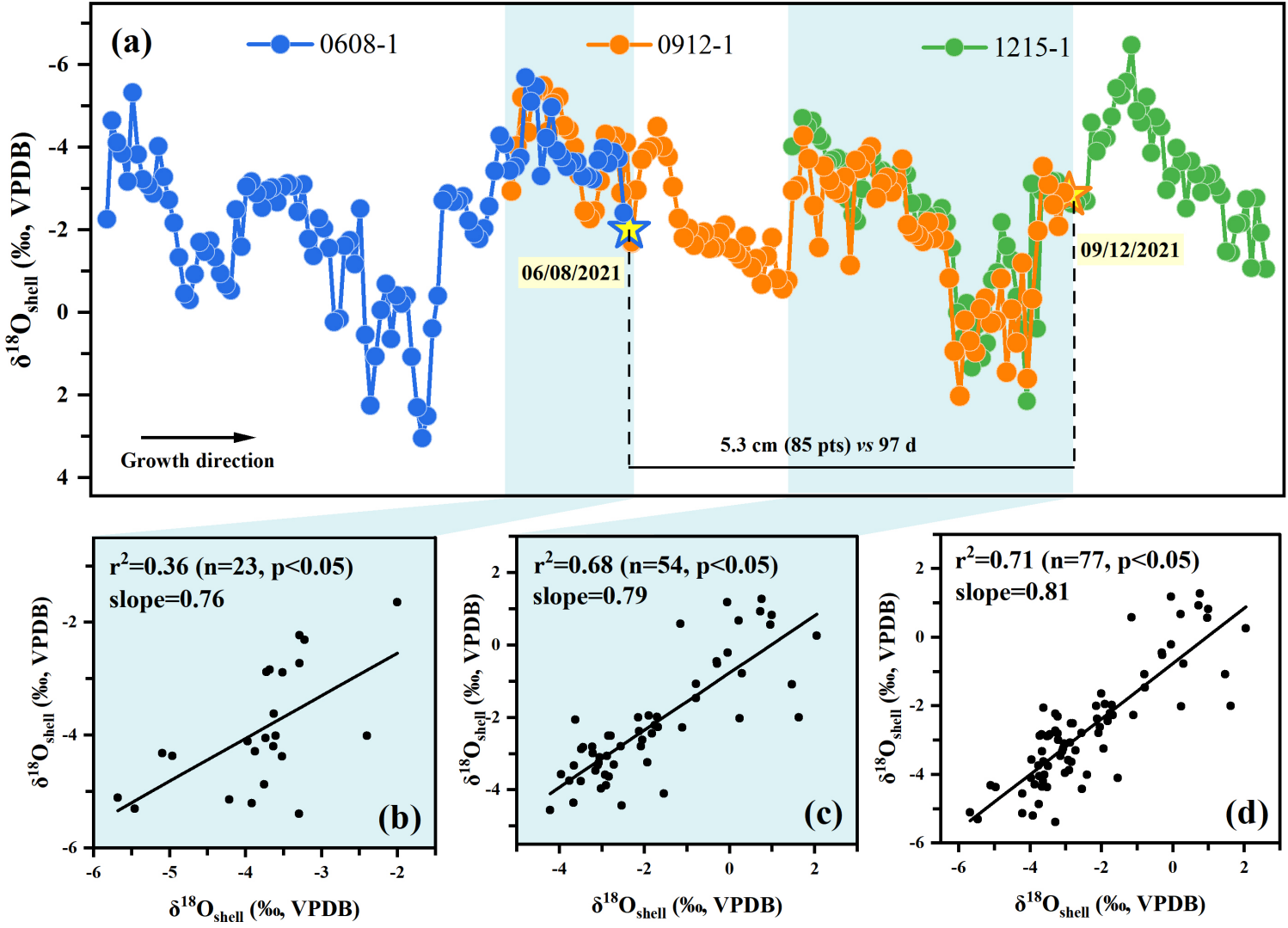 图3 0608-1、0912-1和1215-1蜗牛δ18Oshell序列(a)及其重叠部分的相关性分析(b:0608-1与0912-1;c:0912-1与1215-1;d:0608-1与0912-1,0912-1与1215-1)。