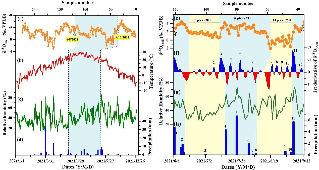 图4 左:拼接后的δ18Oshell序列(a)与2021年日平均温度(b)、相对湿度(c)和降水量(d)。右:0912-1蜗牛6月8日至9月12日的δ18Oshell记录(e),以及δ18Oshell序列一阶导数(f)与同期相对湿度(g)和降水量(h)的对比。