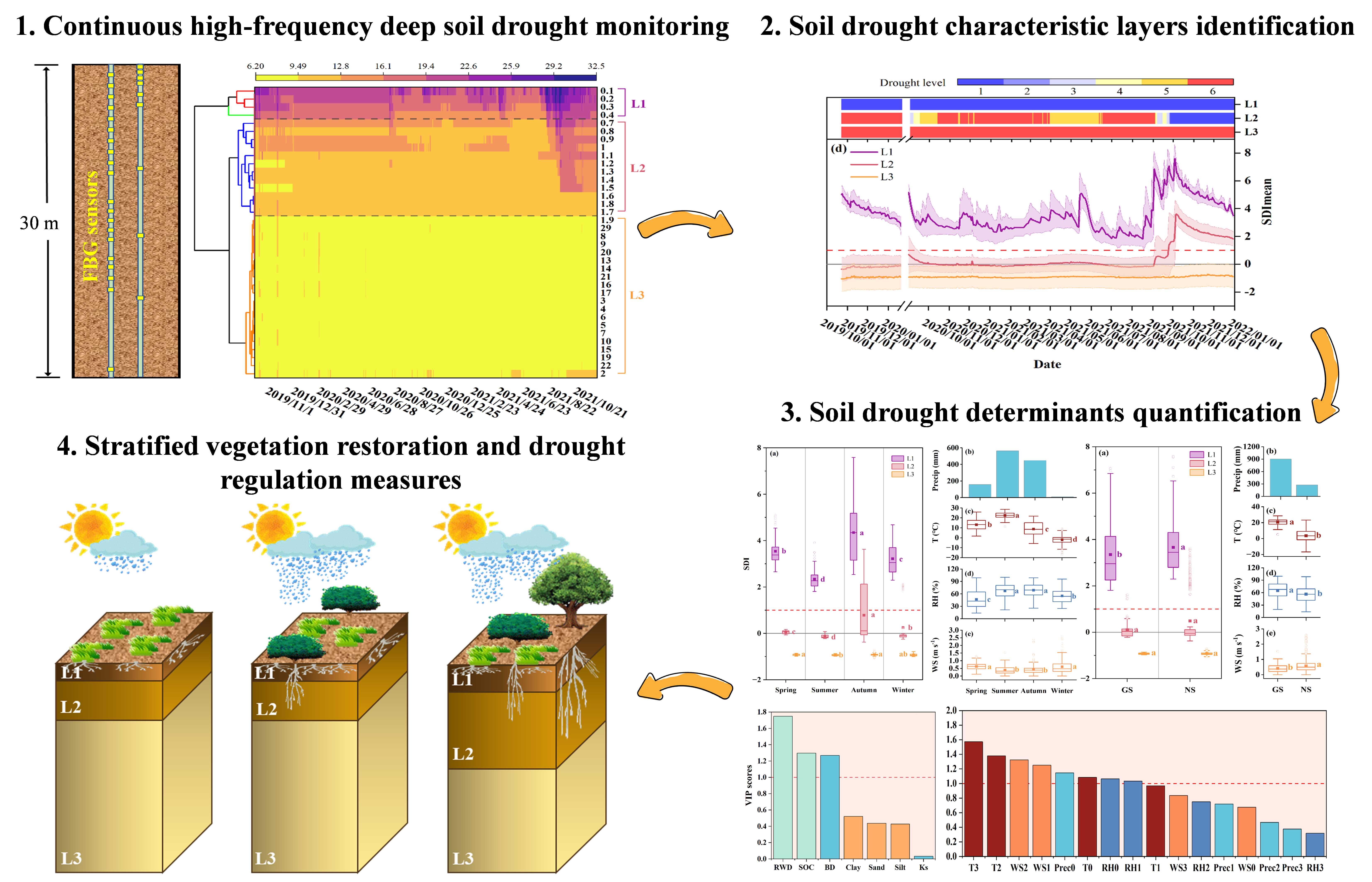 1)刺槐林深层土壤干旱演变规律及环境控制:采用光纤布拉格光栅(FBG)传感器,对0-30 m剖面土壤水分进行了3年的高频、高分辨率连续观测,发现土壤干旱的分布和演化存在显著的分层特征:0-0.4 m土壤水分受温度、降水等上边界条件的直接影响,剧烈波动,但并未出现干旱;0.4-1.8 m土壤干旱动态变化最为频繁;1.8-30 m存在持续而稳定的土壤干旱。土壤有机碳含量、容重和根系分布是影响土壤干旱空间分布的主控因素;对于干旱的时间变化,温度、风速和相对湿度的影响超过了降水;且这些影响存在普遍的协同作用和滞后效应。基于此,团队提出了“土壤特性层识别-分层治理”的干旱调控策略(图1),强调在生态修复过程中充分考虑土壤干旱的分层特性及其异质性,从而实现植被恢复与土壤干旱调控之间的水分需求权衡(Tong et al., 2025)。这一研究深化了对深层土壤干旱时空演化及其环境驱动机制的理解,也为土壤干旱调控和生态修复提供了科学参考。