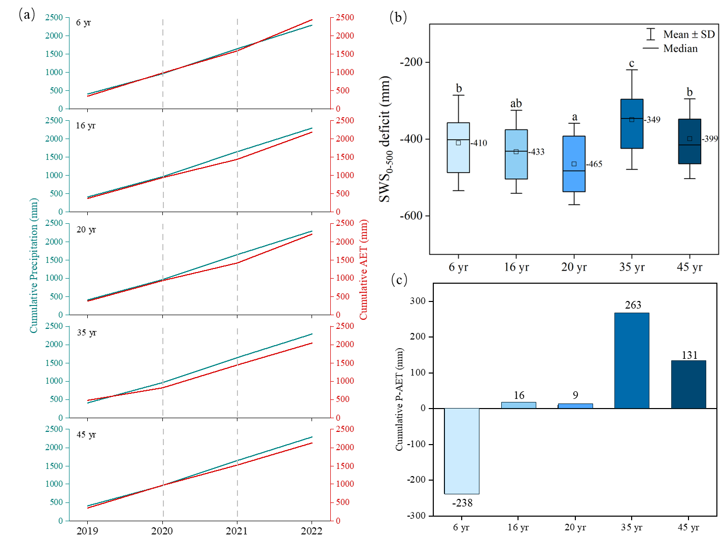 图2 2019-2022年不同林龄刺槐林累积降水量(P)和累积实际蒸散量(AET)分布(a);不同林龄刺槐林0-5 m土壤储水量亏缺分布(b);2019-2022年不同林龄刺槐林累积P-AET(c)。