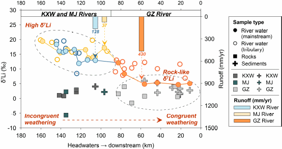 值得注意的是,尽管地形变化显著,从上游两条大支流康西瓦河和木吉河出口,以及中游段盖孜河干流三个水文监测站的水文数据分析,河水δ7Li依然与径流展示了很强的相关性(图1及原文附件),进一步支持了水文对河流δ7Li的重要影响。