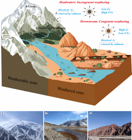 晚新生代以来全球气温下降了约12-15℃,被认为是山脉“构造抬升”通过产生岩石的破碎并提供新鲜矿物表面,加速硅酸盐岩风化,进而吸收大气CO2的结果。然而,山脉“构造抬升”是否驱动全球气候变冷一直争论不断,其核心是缺乏指示硅酸盐岩风化的有效指标。锂同位素(δ7Li)因主要赋存于硅酸盐矿物、在地表风化过程中分馏程度大等优势被认为是示踪大陆硅酸盐岩风化最可靠的指标之一。近20年来,锂同位素示踪硅酸盐岩风化过程的研究引起了广泛讨论,特别是新生代海水δ7Li值呈现出~9‰的上升被归因于构造作用(Misra and Froelich,2012,Science),从而支持“构造抬升-风化”假说驱动新生代变冷。然而,随后的研究发现造山带上游山区呈现低的河水δ7Li值,而下游洪积平原(如恒河、亚马逊等)呈现高δ7Li值,从而提出“构造抬升”产生的洪积平原过程,延长了水岩反应时间并导致了更大的Li同位素分馏和下游河流高δ7Li值,而非山脉抬升本身。此外,全球河水和海水的δ7Li还受到水文变化控制(Zhang et al.,2022,NC)。因此,大陆风化过程中构造抬升与河水δ7Li的关联机制依然需要更多证据支持。