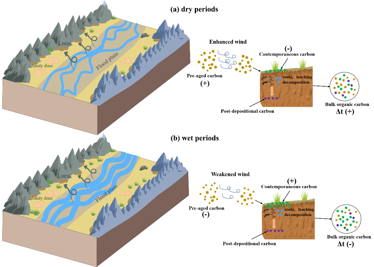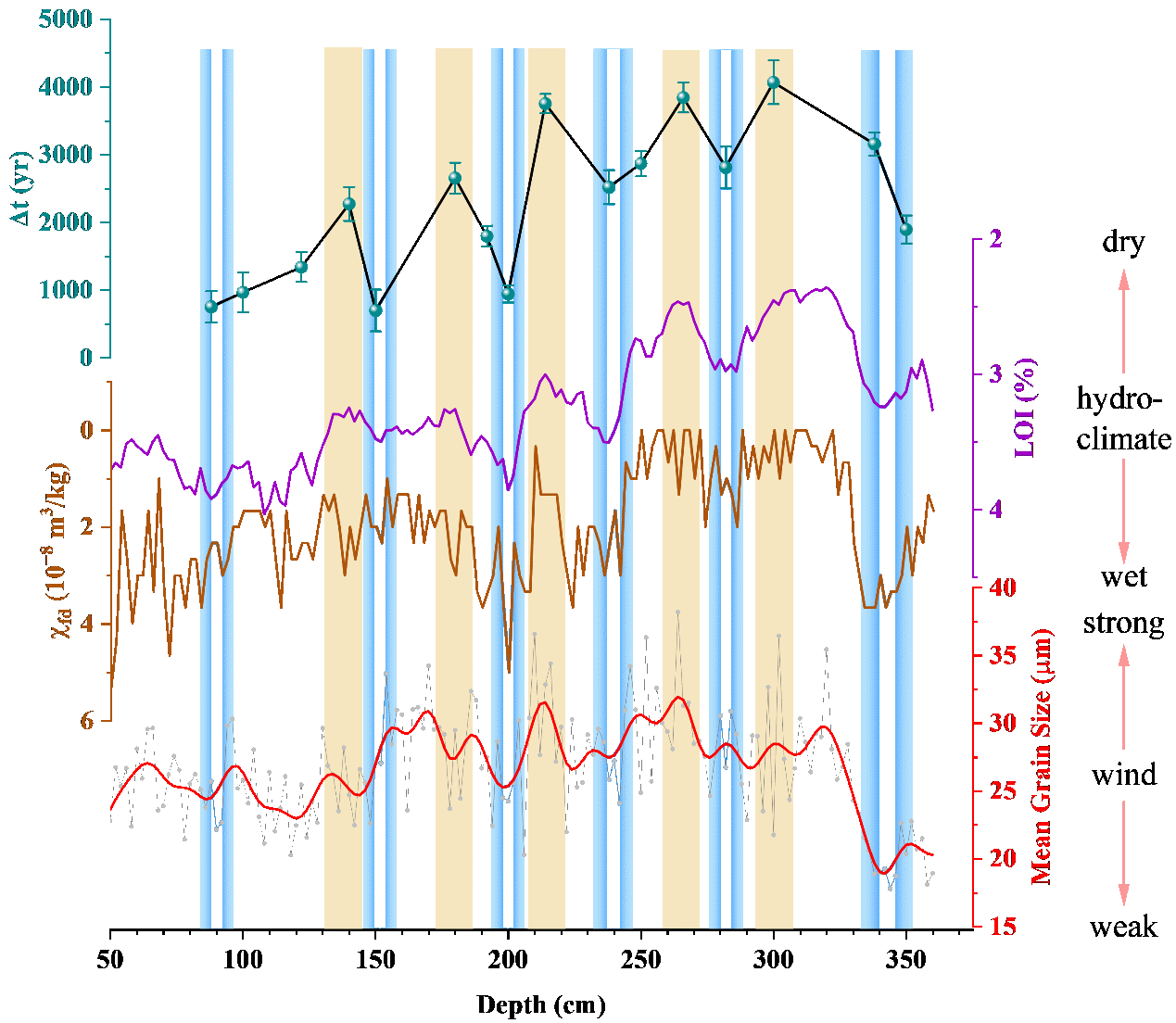 针对这一问题,我室周卫健研究员团队以青藏高原南部雅江中游地区的贡嘎黄土剖面为研究对象,基于大量有机质14C测年数据,并结合丰富碳屑和壳体的可靠年代,建立了百年-千年尺度的Δt时间变化模式。进一步联合烧失量,磁化率,粒度等多种环境代理指标,成功揭示了干旱风成环境中Δt变异性的驱动机制。结果表明Δt主要受气候调节的植被生产力输入,和风成活动调节的沉积物供应影响,而沉积后过程的年轻碳输入影响相对较小。这些发现不仅完善了我们对黄土沉积物碳循环过程及14C年代异常机制的理解,也为建立可靠的黄土年代框架提供了新的科学依据。