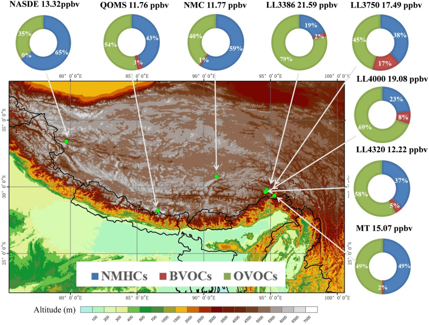 近期,我室AirPNT团队在青藏高原广阔区域内的820米至4750米各海拔高度下,选取高山森林、灌木、草地、湿地和沙地等地理单元建立观测点,分昼夜系统采样并分析了高原南缘与腹地的夏季非甲烷烃(NMHCs)、含氧VOCs(OVOCs)及生物源类VOCs(BVOCs)质量浓度。观测结果显示:
