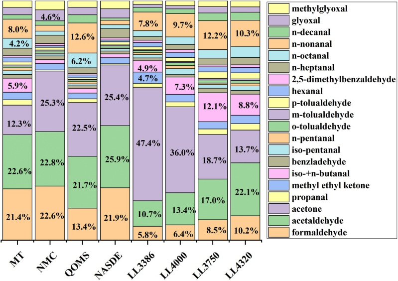 图2. 青藏高原墨脱(MT)、纳木错(NMC)珠峰(QOMS)、阿里(NASDE)鲁朗(LL)大气OVOCs组成特征。