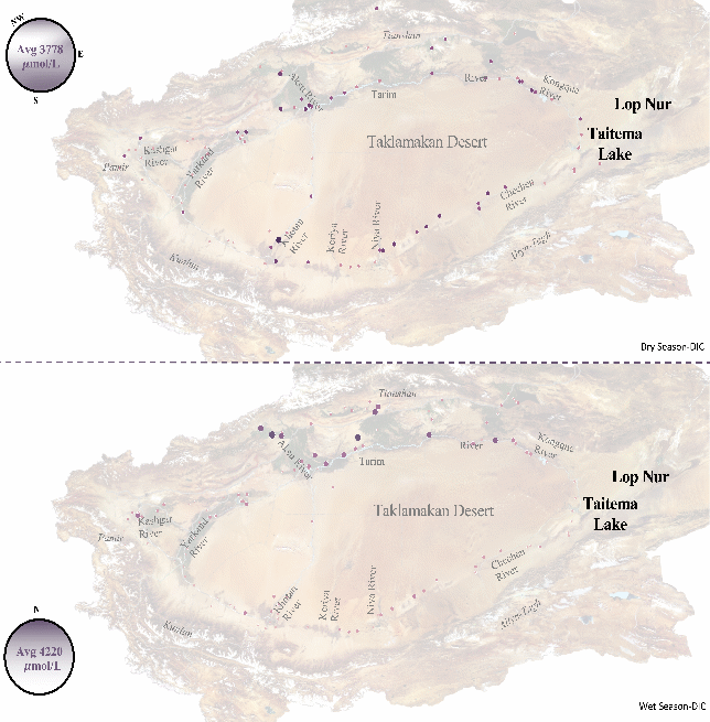 现代河水数据分析表明,塔里木盆地水系径流量分布及流域化学风化存在显著的季节性差异:TDS值在雨季平均值较低且仅分布少数峰值,在旱季则平均值较高,流域TDS峰值增多(图1);DIC在雨季平均值较高,峰值集中于北部阿克苏河及天山地区,旱季全流域高值较多,包括阿克苏河、和田河、车尔臣河、尾闾区等(图2)。对比发现,径流量影响溶解质蒸发-浓缩过程,调控了流域TDS分布;而碳酸盐化学风化则在旱季受到了径流量的限制,风化产物主要由盆地南部车尔臣河流域运输至低地尾闾湖区。雨季时期,塔里木盆地北部水系的高径流量及相对较强的化学风化则揭示了尾闾湖区“汇”的北部贡献较高(图3)。