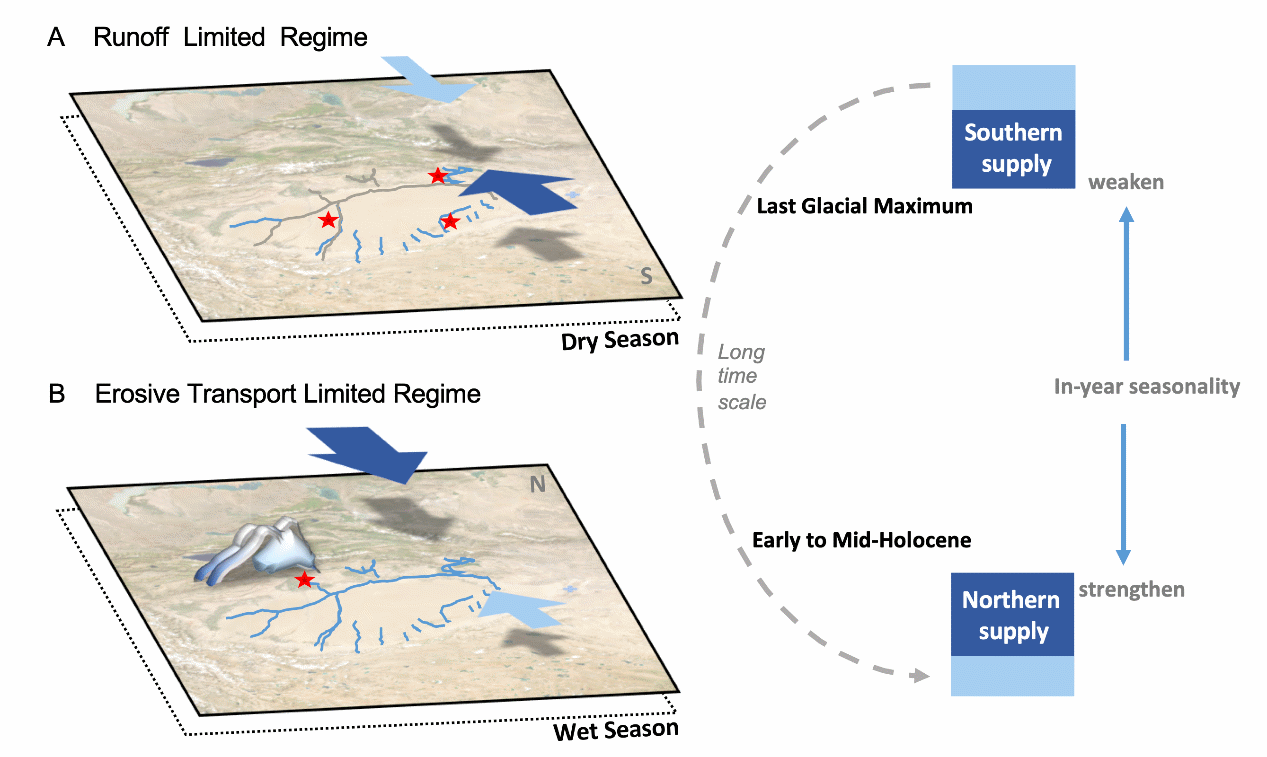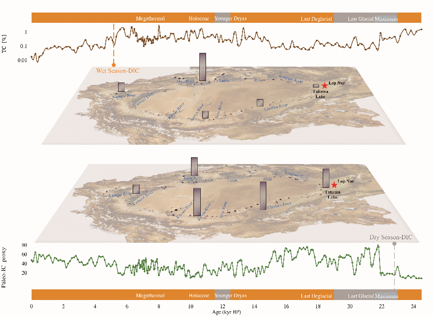 基于此,我室黄土与气候变化团队以塔里木盆地现代不同季节河水及晚更新世以来罗布泊干盐湖钻孔沉积物为研究对象,通过现代流域河水总溶解固体(TDS)及碱度(DIC)、钻孔沉积物总碳(TC)及无机碳(Paleo-IC)含量指标,重建了中亚干旱化背景下塔里木盆地河流源-汇体系演化及罗布泊水文供应的变化史。