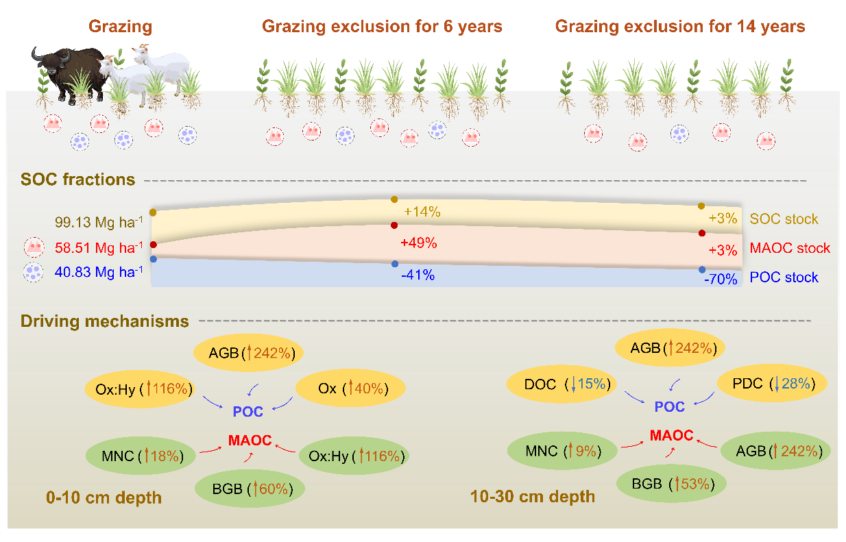 Zhou J., Liu S., van Groenigen K.J., Mueller C.W., Ochoa-Hueso R., Fanin N., Ren Z., Zhang Y., Ma Y., Sun S., Hu J., Zhang Y., Yahdjian L., Wanek W., Olesen J.E., Kuzyakov Y., Liu J., Chen J., 2026. Contrasting responses of particulate and mineral-associated organic carbon stocks to grazing exclusion in an alpine meadow. Agriculture, Ecosystems & Environment, 400: 110227.