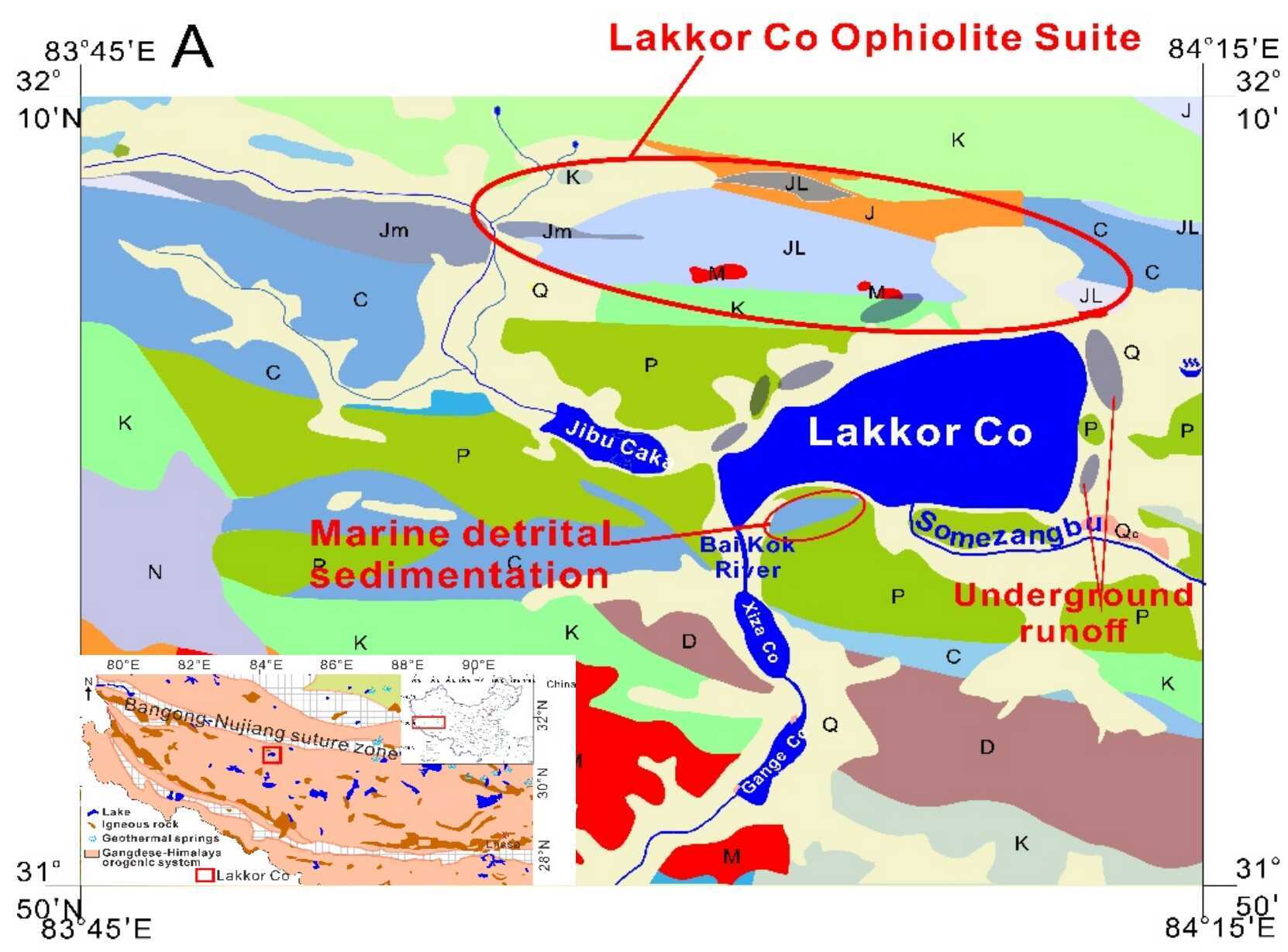 班公措-怒江构造带是青藏高原关键构造带,也是特提斯洋主支消亡的遗迹。受到洋-陆俯冲与陆-陆碰撞影响,其战略资源丰富。拉果错盐湖位于班公措-怒江构造带西端,是一个大型卤水矿床,锂、硼、钾、铷等关键资源储量大,氯化锂约248万吨,三氧化二硼约382万吨,氯化钾约744万吨,氧化铷资源储量1.42万吨,是目前西藏少数正在商业化开发的盐湖之一(图1)。