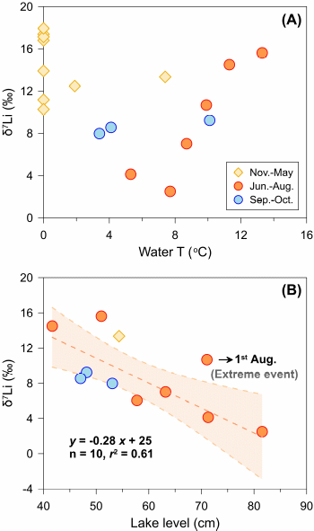 为此,我室金章东研究员团队选取位于典型西风区、有“冰川之父”之称的帕米尔高原慕士塔格流域作为研究对象,通过高时间分辨率(每周)采样,对季节性河水锂同位素(δ7Li)的地球化学行为和受控机制进行了系统研究。研究发现,河水δ7Li呈现显著的季节性变化(从旱季的17.9‰下降至雨季的2.5‰),并且清晰地记录了水文变化信号。具体表现为:河水δ7Li的高值对应较低的湖泊水位,而在湖泊水位较高时期,河水δ7Li值则下降到低值,δ7Li与湖泊水位之间呈现良好的负相关关系(图1)。但是,δ7Li与温度之间未表现出相关性。