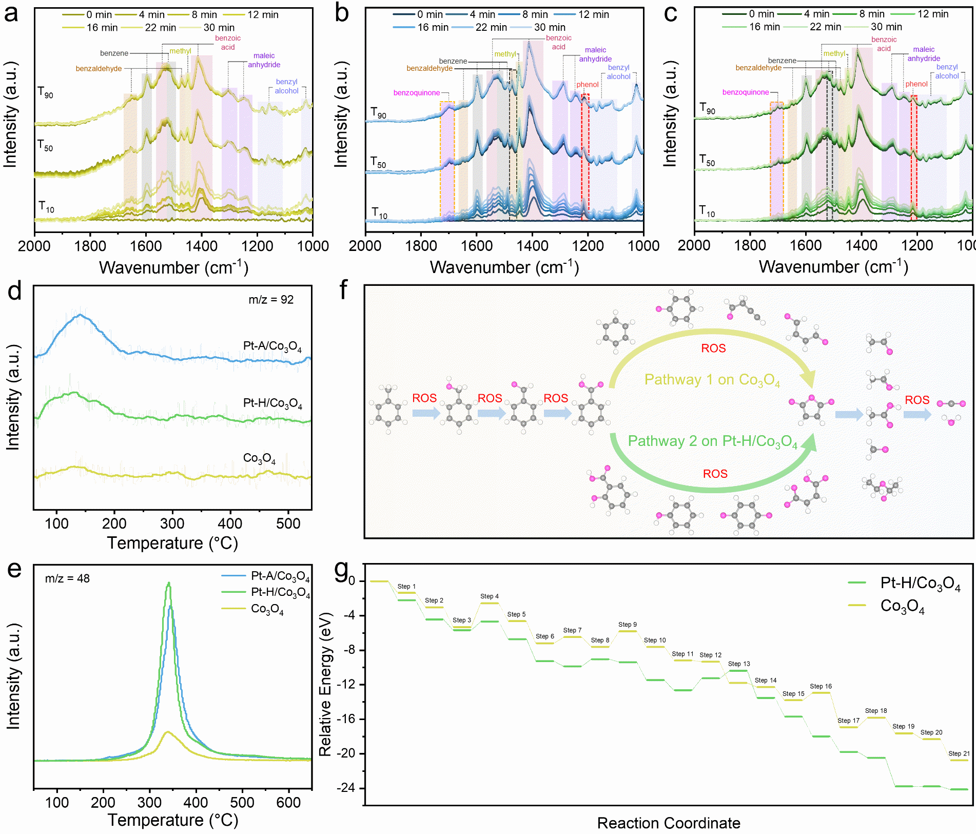 图2. 零价铂单原子与高价铂单原子的甲苯催化氧化性能对比