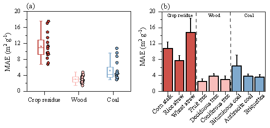图1. 农作物秸秆、薪柴和煤炭家用燃烧排放EC的质量吸收效率(MAE)。