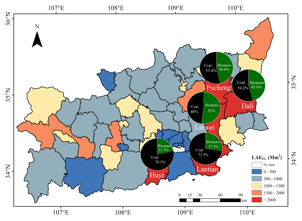 基于此,气溶胶理化过程及环境效应团队通过实验室模拟生物质和煤炭家用燃烧过程,结合热光碳分析仪开展碳组分分析,系统研究了633 nm波长下EC的质量吸收效率(MAEEC),并探究了典型诊断比值对不同燃料类型排放的表征作用。同时结合实测MAEEC、EC排放因子和县级活动数据,建立了关中地区家用燃烧源EC的光学排放清单。研究发现,农作物秸秆燃烧排放的MAEEC值最高(11.2 ± 3.2 m2 g-1),煤炭燃烧排放次之(5.5 ± 2.2 m2 g-1),薪柴燃烧排放最低(3.0 ± 0.9 m2 g-1)。结合碳组分分析,OC/EC 比值是影响MAEEC值的主要因素,这一现象可能归因于有机碳(OC)包覆产生的透镜效应,增强了EC的光吸收能力。光学清单结果显示关中地区2020年家用燃烧源EC的光吸收排放量(LAEEC)为 49.6 Gm2,其中煤炭燃烧贡献 57%,生物质燃烧贡献 43%,且光吸收排放存在明显的区域差异,高值区主要集中在西安和渭南。