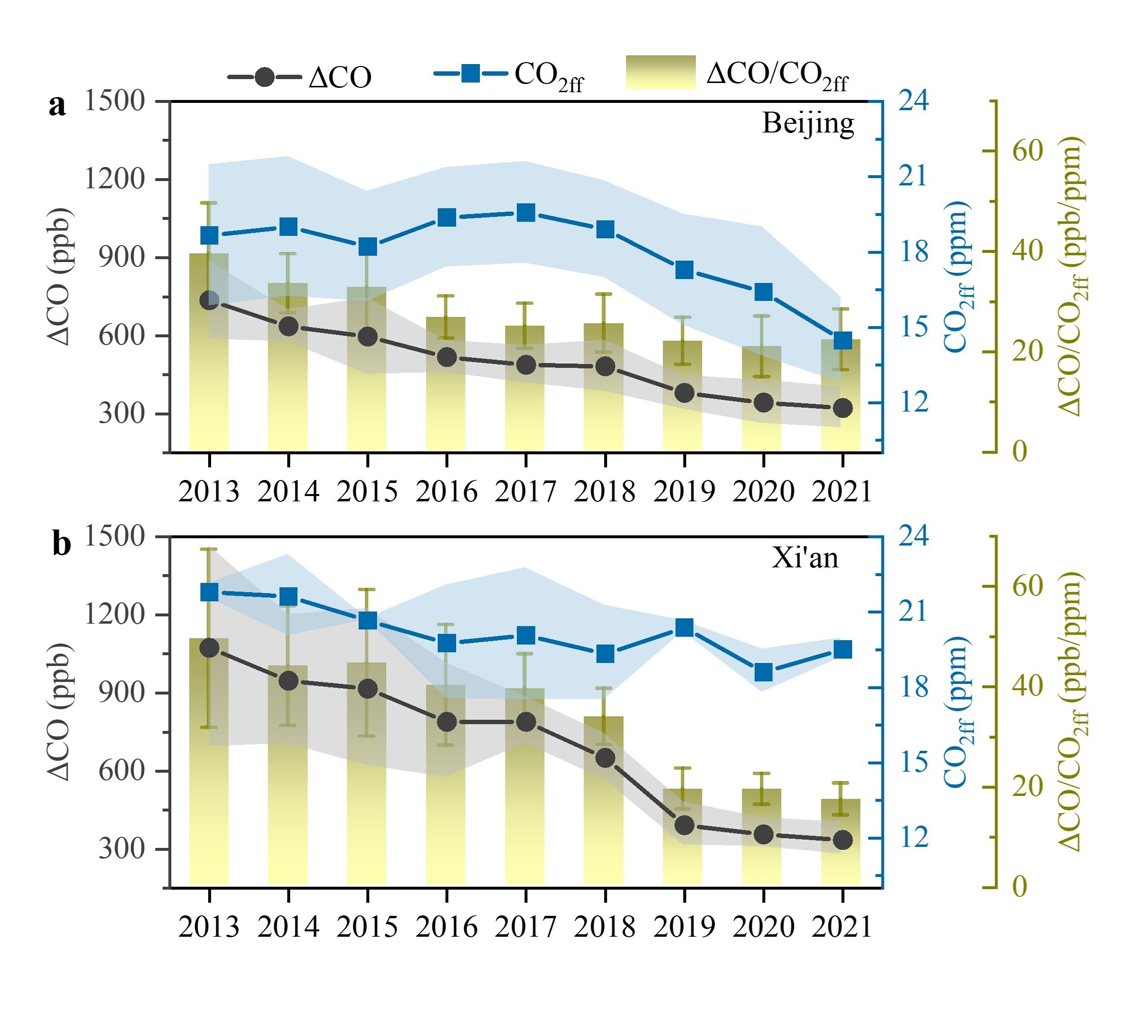 中国科学院地球环境研究所牛振川研究员及其团队通过对北京和西安树轮14C分析,重建了2000至2021年CO2ff浓度序列。结合同期的细颗粒物(PM2.5)、黑碳(BC)及一氧化碳(CO)监测数据,研究发现:在2000至2010年代初,两地CO2ff浓度与大气污染物呈同步上升趋势;自2013年系列清洁空气行动计划实施后,均出现明显下降(图1,2)。研究提出并利用PM2.5/CO2ff比值(即单位碳排放对应的污染物强度)作为衡量指标,结果显示,2013至2021年间,该强度在北京和西安分别下降了58 ± 25%和36 ± 21%(图1),反映空气污染控制效果的持续提升。进一步通过BC/CO2ff与ΔCO/CO2ff比值评估燃烧效率变化,显示两地燃烧效率在2013年后显著改善:北京两个比值分别下降54 ± 19%和44 ± 19%,西安下降幅度分别为56 ± 10%和65 ± 24%(图3,4)。这些结果有力证实,我国在空气污染治理和提升燃烧效率方面取得了实质性进展。