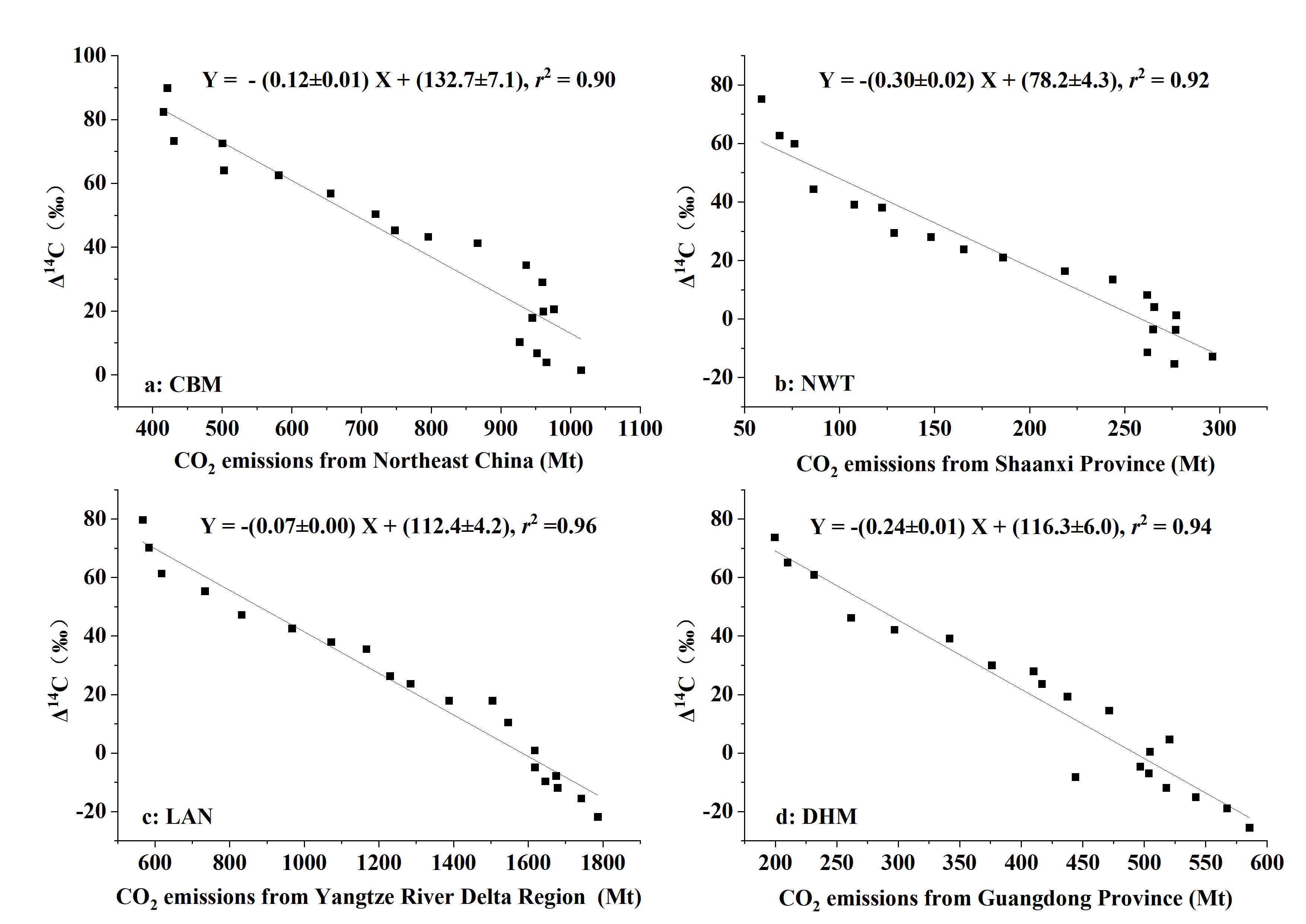 图4 长白山、南五台、临安与鼎湖山树轮Δ14C序列分别与中国东北地区、陕西省、长三角经济区及广东省碳排放量(CEADs, 2024; Shan et al., 2018, 2020)的相关性分析。